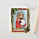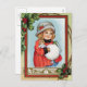 Vintage Christmas card showing a little girl wrapped up warmly with her hands in a white fur muff. She carries a doll and a book and has a sprig of holly in her hat.