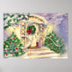 A beautiful vintage Christmassy decorated country house in a winter landscape. Two Christmas trees stand next to the house entrance, in every window lit a candle and on the door hangs a Christmas Wreath. Customize to personalized the gift product!