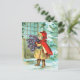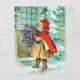 Cute vintage Christmas postcard image of little girl in red cape carrying a bouquet of violets. Snow covered trees and ground. Great old Xmas image from an old card.