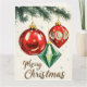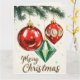 This Christmas card features three vibrant ornaments hanging from snow-dusted evergreen branches. Two ornaments are classic red with glossy finishes, while the third is a green diamond-shaped decoration. The red ornaments include a round ball with small star-like sparkles and another with a teardrop shape, decorated with circular patterns. Beneath the ornaments, the words "Merry Christmas" are written in an elegant, glittering gold font. The background is lightly sprinkled with small stars and snowflakes, giving the postcard a festive and cheerful holiday feel.