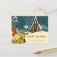 Early 1900's holiday greeting card with a group arriving in front of a snow covered country cottage and blue hour evening sky going to a Christmas party. With editable message and family name in vintage gold script on the front and message, address on back, it is a perfect seasonal card for every vintage Christmas lover.