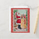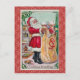 This cute custom vintage postcard features Santa Clause holding his bag full of toys. Behind Santa is a shelf that displays a toy drum, toy oven, toy boat, and teddy bear, a musical horn is lying on the floor next to Santa's boots. The words "Christmas Greetings" are displayed at the bottom of the card. The vintage image is set against a snowy red Christmas background to complete this lovely postcard.