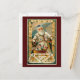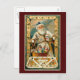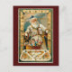 This cute custom vintage postcard features Saint Nicholas, he is holding a twig in one hand and a book in the other. Sitting in front of Santa is a small basket of toys. In the upper right corner of the card the words "A Happy Christmas" is displayed. The vintage image is set against a dark red, ornamental, Christmas background to complete this lovely postcard.