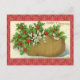 This cute custom vintage postcard features a wooden dutch shoe filled with white flowers, holly, and ivy. The words "Merry Christmas" are displayed in gold lettering in the upper right corner of the card. The vintage image is set against a snowy red Christmas background to complete this lovely postcard.