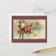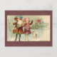 This beautiful custom vintage postcard features two little girls and a little dog playing in the snow, the little girl on the right is holding a snowball in her hand. The girls are wearing dresses, coats, and hats, with a blue, and pink sash that trim the girls' hats. The words "A Joyful Christmas" are displayed to the right of the children. The vintage image is set against an elegant red ornamental background to complete this lovely vintage postcard.