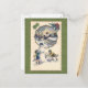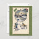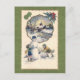 This adorable custom vintage postcard features children playing in the snow. The children are rolling snowballs and building a snowman. The snowman has a carrot nose with black eyes, and is wearing a black hat. In the snowy background there is a cosy cottage with a church and a snowy little bridge with a creek running underneath it. Two four leaf clovers are displayed in the upper left corner of the card, and a horseshoe with red ribbon and pine branches is displayed in the upper right corner of the card. The vintage image is set against a beautiful ornamental green Christmas background to complete this lovely postcard.