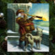 This Victorian Era image shows an old, jolly Saint Nicholas at his workshop in the North Pole looking out over the horizon with a telescope. His pet dog is by his side while the sunrise is in the distance over the ocean with icebergs.