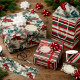 This festive holiday card features a pair of shiny red Santa boots with white fur trim, hanging from a large, teal-blue ribbon bow. The vintage-style illustration is set against a light cream background filled with delicate, sketched pine branches and small red berries. The overall look is classic and nostalgic, combining traditional Christmas elements into a seamless and decorative arrangement.
