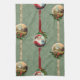 Rich Victorian inspired design featuring circular vignettes of a winter scene and vintage smiling Santa on filigree frames with holly embellishments and satin ribbons on a soft hunter green damask background.