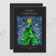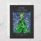 These beautiful 5" x 7" flat Christmas greeting cards feature a hand made watercolor stained glass design featuring a Christmas tree with a gold star with red ornaments with a background in shades of blue. The editable greeting is "Merry Christmas." The back has the editable message, "Wishing you peace, love and joy this holiday season," with placeholders for your name and year in a signature style font.