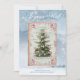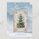 A vintage Christmas tree label art illustration overlay on a watercolor winter snow scene background in deep soft blue and white. Snow scene on the back also. A seasonal card with a soft serene nature scene for a cosy homey vibe.