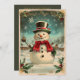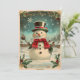Send joyful holiday greetings with this charming vintage-style Christmas card, featuring an adorable snowman dressed in a classic top hat and scarf, set against a picturesque winter village scene. Surrounded by holly and falling snowflakes, this nostalgic design evokes the magic of a classic holiday season, perfect for sharing warmth and cheer with loved ones. Personalise the back with your heartfelt message to make it uniquely yours. Ideal for those who cherish retro holiday aesthetics and timeless festive charm.