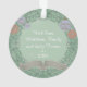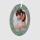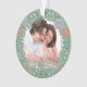 Decorative and ornate family portrait ornament. A green lace wreath decorated with baubles frames your photograph with delicate snowflakes dotted over your photograph. Personalize on the reverse with a Christmas message for a gift or as a family keepsake.