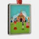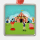 Step right up, folks! Step right up to the amazing Vintage Circus Christmas Ornament. Yes, come one, come all! This mid century modern, minimalist art design features a cartoon drawing of a genuine, three-ring circus. Take it all in. On the lush, green grass, you can see a ringmaster wearing a red coat with tails, orange pants, and a black top hat. In one hand he is holding a green megaphone, which allows him to be heard while telling you to step right up! Behind the ringmaster, there is a beautiful woman juggling five balls. Judging from the stars on her navy skirt and orange top, she is a star of the show. To the left of the man with the megaphone, we see a brawny, muscleman. It takes confidence to pull off a navy, one-shouldered, unitard, but Mr. Strong Man does it with style. My goodness! Check out those bulging biceps as his lifts that dumbbell as if it's as light as a feather. His black, handlebar moustache looks as manly as the rest of him. To the left of the body builder, there is a pink, baby elephant standing on a red podium. Don't worry. The juvenile pachyderm appears to be as tame as a kitten. Towards the rear of the scene, we can see a mad-capped man making a real clown of himself. He didn't buy that red and yellow, harlequin style suit off the rack! His blue hat, orange and yellow hair, white face paint, and red nose would make him unrecognisable to his own mother. And this is only the excitement we can see! Who knows what lively antics are playing out in the three big tops that grace the background! Two blue and aqua tents are flanking a giant red and cream striped big top tent with yellow and black letters that spell out, "CIRCUS." A yellow, banner flag is waving from the top of each tent. The sky is shades of aqua, teal, blue and white and is filled with magical, white stars. Just like the circus itself, this design is fun for the whole family and is perfect for children of all ages!