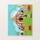 Step right up, folks! Step right up to the amazing Vintage Circus Puzzle. Yes, come one, come all! This mid century modern, minimalist art design features a cartoon drawing of a genuine, three-ring circus. Take it all in. On the lush, green grass, you can see a ringmaster wearing a red coat with tails, orange pants, and a black top hat. In one hand he is holding a green megaphone, which allows him to be heard while telling you to step right up! Behind the ringmaster, there is a beautiful woman juggling five balls. Judging from the stars on her navy skirt and orange top, she is a star of the show. To the left of the man with the megaphone, we see a brawny, muscleman. It takes confidence to pull off a navy, one-shouldered, unitard, but Mr. Strong Man does it with style. My goodness! Check out those bulging biceps as his lifts that dumbbell as if it's as light as a feather. His black, handlebar moustache looks as manly as the rest of him. To the left of the body builder, there is a pink, baby elephant standing on a red podium. Don't worry. The juvenile pachyderm appears to be as tame as a kitten. Towards the rear of the scene, we can see a mad-capped man making a real clown of himself. He didn't buy that red and yellow, harlequin style suit off the rack! His blue hat, orange and yellow hair, white face paint, and red nose would make him unrecognisable to his own mother. And this is only the excitement we can see! Who knows what lively antics are playing out in the three big tops that grace the background! Two blue and aqua tents are flanking a giant red and cream striped big top tent with yellow and black letters that spell out, "CIRCUS." A yellow, banner flag is waving from the top of each tent. The sky is shades of aqua, teal, blue and white and is filled with magical, white stars. Just like the circus itself, this design is fun for the whole family and is perfect for children of all ages!