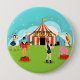 Step right up, folks! Step right up to the amazing Vintage Circus Round Button. Yes, come one, come all! This mid century modern, minimalist art design features a cartoon drawing of a genuine, three-ring circus. Take it all in. On the lush, green grass, you can see a ringmaster wearing a red coat with tails, orange pants, and a black top hat. In one hand he is holding a green megaphone, which allows him to be heard while telling you to step right up! Behind the ringmaster, there is a beautiful woman juggling five balls. Judging from the stars on her navy skirt and orange top, she is a star of the show. To the left of the man with the megaphone, we see a brawny, muscleman. It takes confidence to pull off a navy, one-shouldered, unitard, but Mr. Strong Man does it with style. My goodness! Check out those bulging biceps as his lifts that dumbbell as if it's as light as a feather. His black, handlebar moustache looks as manly as the rest of him. To the left of the body builder, there is a pink, baby elephant standing on a red podium. Don't worry. The juvenile pachyderm appears to be as tame as a kitten. Towards the rear of the scene, we can see a mad-capped man making a real clown of himself. He didn't buy that red and yellow, harlequin style suit off the rack! His blue hat, orange and yellow hair, white face paint, and red nose would make him unrecognisable to his own mother. And this is only the excitement we can see! Who knows what lively antics are playing out in the three big tops that grace the background! Two blue and aqua tents are flanking a giant red and cream striped big top tent with yellow and black letters that spell out, "CIRCUS." A yellow, banner flag is waving from the top of each tent. The sky is shades of aqua, teal, blue and white and is filled with magical, white stars. Just like the circus itself, this design is fun for the whole family and is perfect for children of all ages!