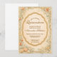 A romantic coastal design featuring delicate seashells, starfish, soft coral florals, and flowing seaside greenery surrounding an elegant ornate frame. The watercolor illustrations and warm antique parchment background create a timeless beach garden aesthetic inspired by vintage botanical prints and ocean charm. Perfect for a refined seaside celebration with soft coastal elegance.