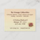 This elegant business card is advertising a vintage collectable boutique. The front has an old-fashioned, antique feel to it. Magenta pink mums and white pearls with purple stones are set on lace against a pale yellow background. The darker vignette at the corners adds a dramatic effect. This is truly a scene from another time and place. The image is repeated on the back on a pale pastel gradient. Customise all text to fit your special business.