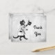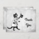 A custom Thank You postcard with retro script and a vintage black and white drawing of a cat wearing glasses and a coat tipping his top hat on a grungy faux parchment background.