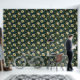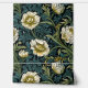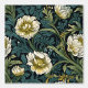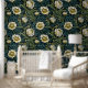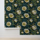 Elegant vintage William Morris-inspired wallpaper featuring illustrations of cream flowers and with teal and green leaves on a black background.