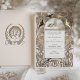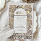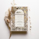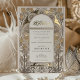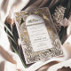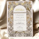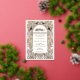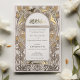 Crafted with a delicate balance of tradition and elegance, this wedding invitation is a perfect blend of cultural heritage and contemporary design. The invitation’s front is graced with a vintage cream background, accented with a sophisticated palette of gold, taupe, and chocolate brown, exuding a warm and inviting ambiance. A central tree adorned with goldenrod berries becomes the focal point, symbolising life and unity, encircled by a laurel wreath in taupe and accented with flowing ribbons. The Arabic calligraphy above the tree adds an authentic touch of Islamic art. On the reverse, the design continues with a graceful floral pattern in matching hues, enveloped by a decorative gold foil arch, highlighting the intricacies of the art form. The text, in elegant typeface, is set against a clean cream backdrop, inviting guests to a celebration of love and commitment.