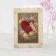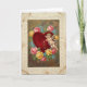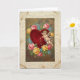 This greeting card shows a large red heart in the center that looks soft and plush. To the right, a round-cheeked cherub with small white wings floats in the air, aiming a gold arrow as tiny sparkles fall below it. A ring of flowers surrounds the scene, with pink and yellow roses mixed with small light-blue forget-me-nots. Behind everything is a dark, aged gold background with fine cracks that make it feel old-fashioned. A cream border with raised swirls and floral details frames the picture and gives it a classic finish. There isn’t any printed message visible on the front, so the artwork does all the talking 💘❤️.
