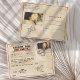 The front includes a small photo area — perfect for adding an editorial-style image or couple portrait — while the back offers space for a larger customisable photo along with the classic “Please deliver to” section and stamp area, just like a real postcard.