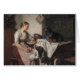Vintage artwork by Adolf Eberle features a scene in a home with a woman sitting at a table taking a break from her housework to eat a meal. She holds a bowl of food and a spoon in her hand, and is amused to see her pet Dachshund on top of the table watching intently, and her pet Pointer dog standing in front of her on the floor with its nose just inches from her bowl. Can we have some, please? The German artist, Adolf Eberle (1843-1914) was born in Munich. His father, Robert Eberle, was also a painter. Adolf’s most common and favourite subjects were family life scenes, including huntsmen and farmers, from Bavarian and Tyrolean peasant life. Many of these scenes also included pet animals. This card is blank inside for your own message.