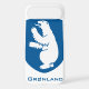 Greenland is a country within the Kingdom of Denmark, Danmark, Danemark. Vintage illustration Danish royal coat of arms of Greenland; a blue shield with a silver polar bear. This symbol was first used in 1666 and is still represented in the arms of the Danish royal family. The bear was originally shown walking naturally, but in 1819 an upright position was specified. The polar bear symbolises the fauna of Greenland and the blue designates the Atlantic and the Arctic Oceans. Instead of the Danish version in the royal arms which follows the heraldic tradition in raising the right forepaw, the polar bear on the Greenlandic coat of arms raises the left forepaw, due to the traditional Inuit belief that polar bears are left-handed. The polar bear was first included as a symbol of Greenland in the Danish coat of arms during the reign of King Frederick III of Danmark.