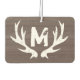 Vintage deer antlers monogram car air freshener with brown wood grain background. Custom freshener with your own personalised monogram initial letter. Add your own custom text for name, funny quote or monogram. Personalizable design to refresh your auto with different cool scents to mask dog / pet smell and other dirty stinky odours. Unique gift idea for men and women.. Custom air refreshener with customisable template. Make it smell like a fresh new car or the sea. Double sided design. Animal Hunting theme graphic. Rustic distressed look. Cute party favour for country chic wedding, birthday, anniversary, etc.