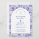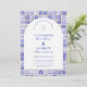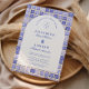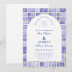 A timeless blue and white design inspired by classic Delft porcelain and French toile patterns. The patchwork tile border combines delicate florals, stripes, and ornamental motifs that evoke vintage European ceramics. A soft arched panel in the centre keeps the layout refined and elegant while allowing the details of the porcelain-inspired pattern to frame the celebration beautifully. Perfect for couples planning a sophisticated blue and white wedding with traditional European charm.