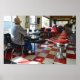 The red and white tiled floors, the red vinyl stools and booths with aluminum trim adds to the vintage feel and appeal. This diner building is a modified double deluxe Valentine model.