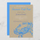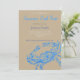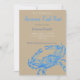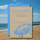 Elegant beach style invitation for a Summer Crab Feast .It features a vintage illustration of a blue crab with your party details in different shades of blue and grey . The headline comes in calligraphy style fonts . Coastal style card with khaki (#C3B091) front solid blue reverse . Design by Alma Wad .