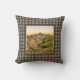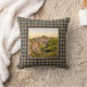 Throw pillow with a vintage photo lithograph of Dunnottar Castle in Scotland from 1895 pictures the ruins of a mediaeval castle on a cliff overlooking the sea, with rolling green hills in the foreground. Digitally cleaned, enhanced and artistically rendered to resemble pen and ink with watercolors. Framed and backed with the Clan Sutherland ancient weathered tartan, a traditional Scottish plaid pattern in shades of golden tan, light green and red, with black and white highlights.