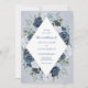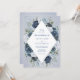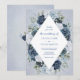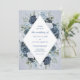 A chic vintage invitation displaying your wedding details inside a white diamond element surrounded by lush flowers in shades of blue, navy and white, all on a warm dusty blue watercolor background. The card reverses to a small floral arrangement in the centre. This invitation is part of a beautiful matching wedding suite that can be fully personalised.