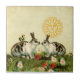 Vintage Easter bunnies collage with antique illustrations of black and white spotted rabbits facing each other, standing in a field of flowers (poppies and daisies). Two baby chicks are standing in the long grass amongst the flowers, and one chick is riding on the back of one of the bunnies. A vintage sun picture has been added to the background, which has been antiqued to look like old paper. Floral swirls are also part of the charming background of this colourful and original vintage collage celebrating spring and Easter with bunnies and chicks.
