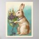 Easter bunny holds a beautiful green egg decorated with violets. Cute retro cool colourful funny sweet artistic Victorian decorative animal floral and landscape art.
