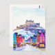 A retro postcard featuring Edinburgh Castle in winter, with colourful old town houses and snowy streets. A striking travel illustration that captures the charm of Scotland.