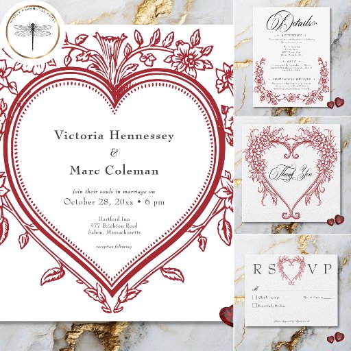 Capture timeless romance with our vintage-inspired wedding invitations. This elegant square design features a white background resembling cracked porcelain, evoking a classic Victorian antique charm. At the centre, a stunning dark red chinoiserie floral heart holds your wedding details in beautifully vintage typography. The back showcases the couple's first initials nestled within a matching floral heart, creating a cohesive and unforgettable design. Perfect for couples who love old-world elegance with a modern twist. Created by Simply Farmhouse Press.