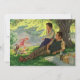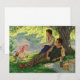 Vintage illustration daily life scene featuring a family having a picnic. Mum and dad are sitting by lunch on the blanket in the shade of a tree while the brother and sister and playing in the grass.