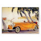 Vintage illustration travel and transportation image featuring a family travelling in an orange antique convertible automobile along the Florida coast. A woman is water skiing and palm trees are swaying in the gentle breeze.
