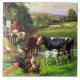 An enhanced public domain photograph of a vintage farm scene from a children's bible storybook . Animals include cows, horses, sheep, ducks, chickens, a rooster and a mule.
