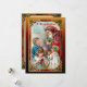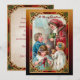 Beautifully restored Victorian-era holiday illustration featuring Old World Father Christmas giving gifts to children and Merry Christmas greeting framed by an ornate red, green and gold ornamental gothic style frame and coordinating artisan background. Back features matching frame, antique paper texture and editable text fields.