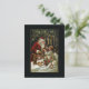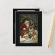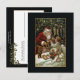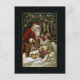 Elegant and timeless traditional Christmas art featuring smiling red-robed Santa giving gifts to a child in bed with stockings hanging nearby and mistletoe overhead. Art is embellished with gold highlights. Back features unique custom complementary graphics with editable text fields.