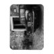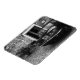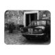 Rectangular photo magnet with a vintage FIAT 850 car in front of a house with two bicycles in Italy in black and white.