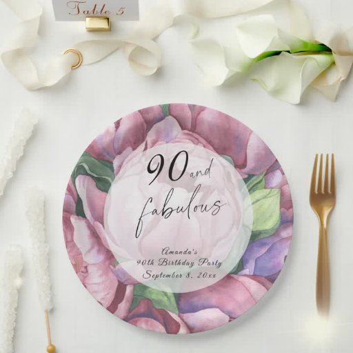 Vintage Floral 90th Birthday Party invitation featuring "90 & Fabulous" in a stylish script and watercolor peonies (peony roses).