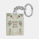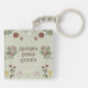 A vintage garden keychain with floral elements and custom text, in muted green, red, pink, white and yellow colours.
