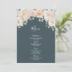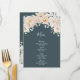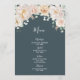 An elegant vintage floral menu to compliment your spring or summer wedding with sophisticated bouquets of cream and blush watercolor flowers, spring pastel greenery and a navy blue background.
