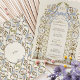 This beautifully crafted wedding invitation exudes a timeless charm with its intricate Victorian floral motif. Delicate shades of sky blue, blush pink, and olive green intertwine with accents of gold and rich chocolate brown, creating an enchanting garden of elegance. The design features a harmonious blend of florals, ribbons, and wheat sheaves, symbolising growth and unity. Perfect for a classic and romantic wedding, this invitation is printed on a warm, creamy paper that adds to its vintage allure. The sophisticated script and serif fonts add a touch of formality to the occasion. Invite your guests to your special day with this exquisite piece of art that they will surely treasure.