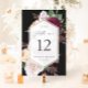 A romantic, vintage floral table number card featuring beautiful rich plums and pale pink rose botanical with a modern geometric shape and rose gold frame and couple monogram.